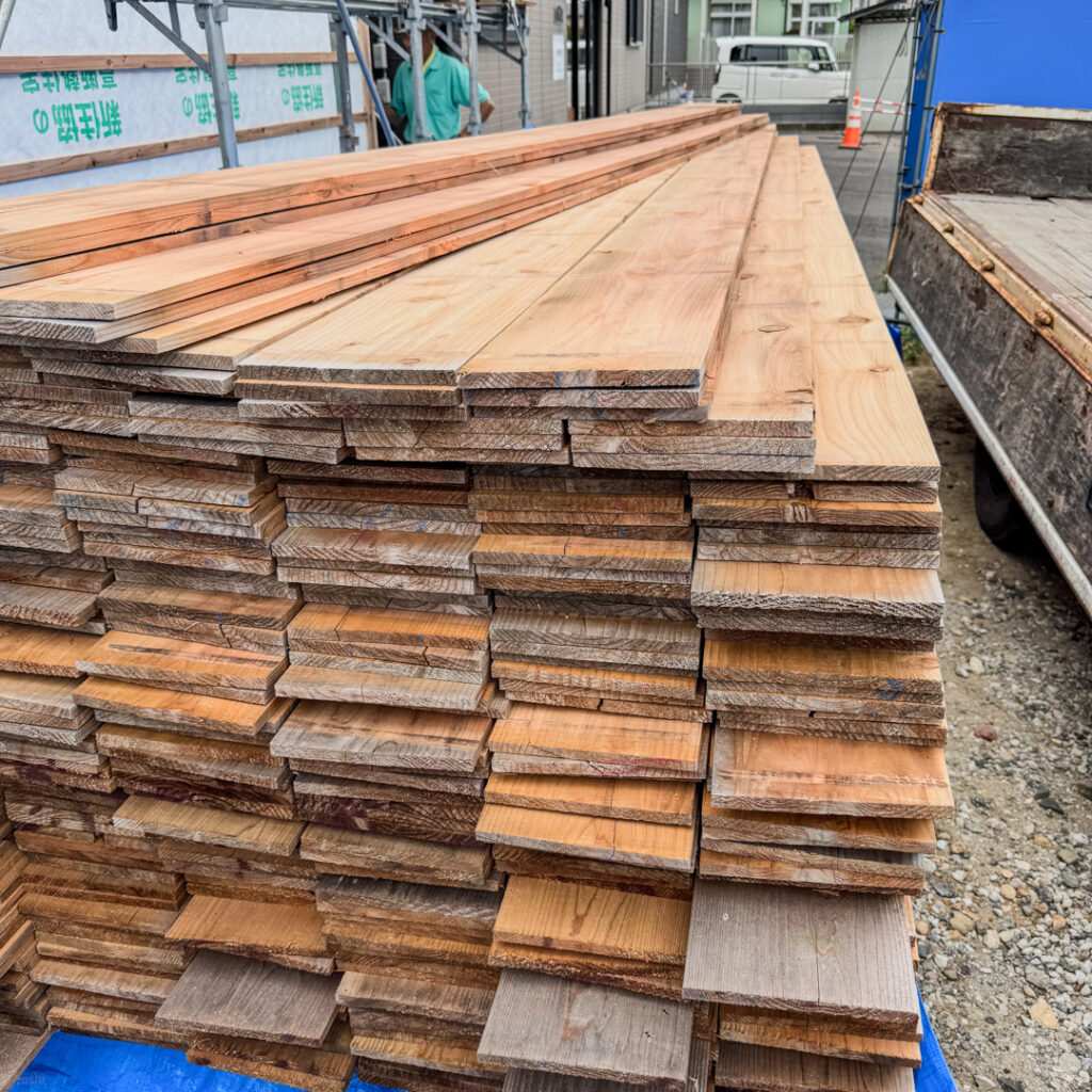 付加断熱工事を終えて パラペット通気 床下点検 を終えて 外壁杉材を準備しました