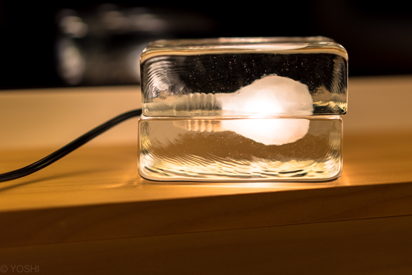 暗くなると、「ヨシのいえ」モデルハウスの北西の窓で小さく明るく朝まで点灯しているのがこのブロックランプです。